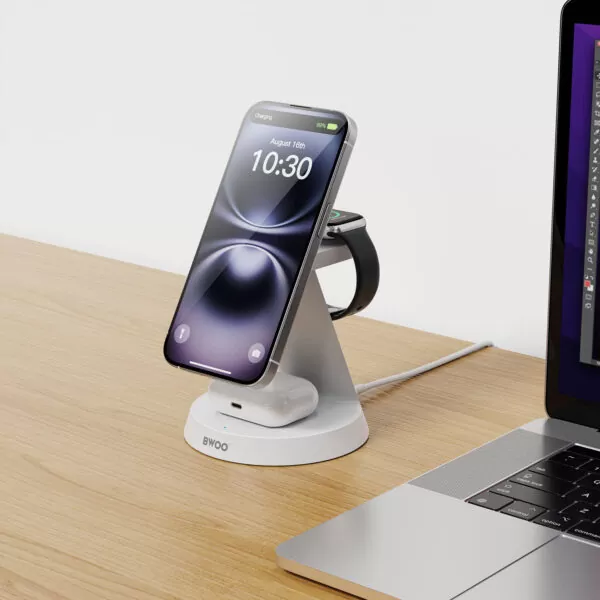 BWOO 3 u 1 magnetski bežični punjač ima tri sučelja za punjenje, što vam omogućuje punjenje iPhonea, Apple Watcha i bežičnih slušalica u jednom elegantnom uređaju, omogućujući vam da se oprostite od zapetljanih kabela i uživate u praktičnosti držanja svih vaših bitnih uređaja na jednom organiziranom mjestu, savršenom za bilo koji stol, noćni ormarić ili radni prostor.